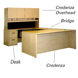 Bridge connects the desk and the credenza to form the "U" shape of the unit. Unit includes grommets and adjustable keyboard tray.