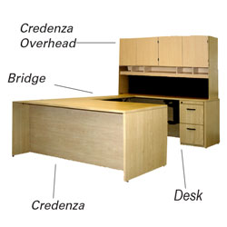 Bridge connects the desk and the credenza to form the "U" shape of the unit. Unit includes grommets and adjustable keyboard tray.